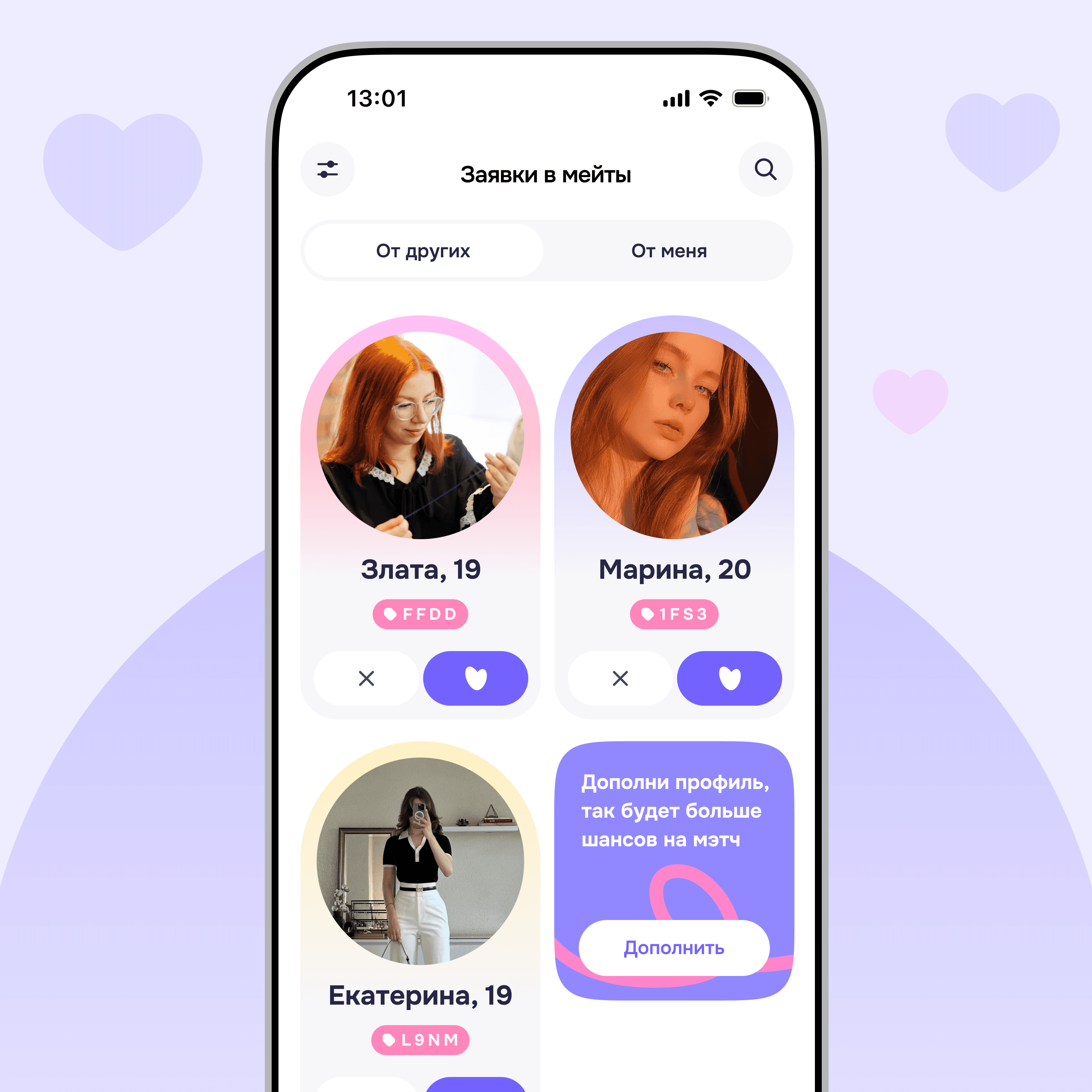 Дейтинговое приложение для интровертов. Помогает познакомиться с интересующим человеком в реальной жизни без прямого контакта. Для этого используются брелки с уникальным 4-значным кодом профиля, введя который можно узнать интересы и увлечения другого человека