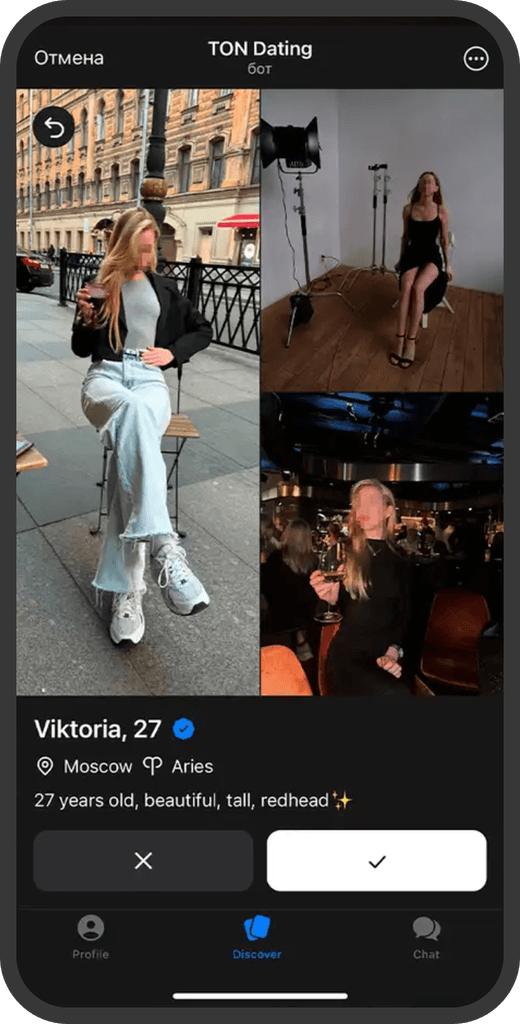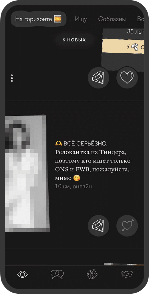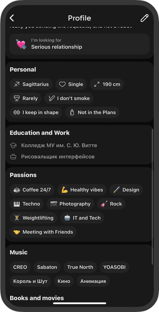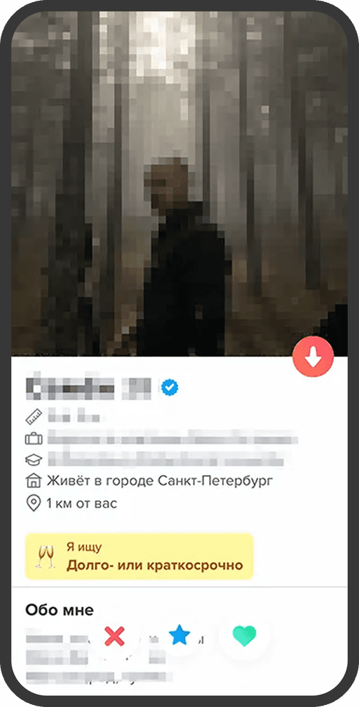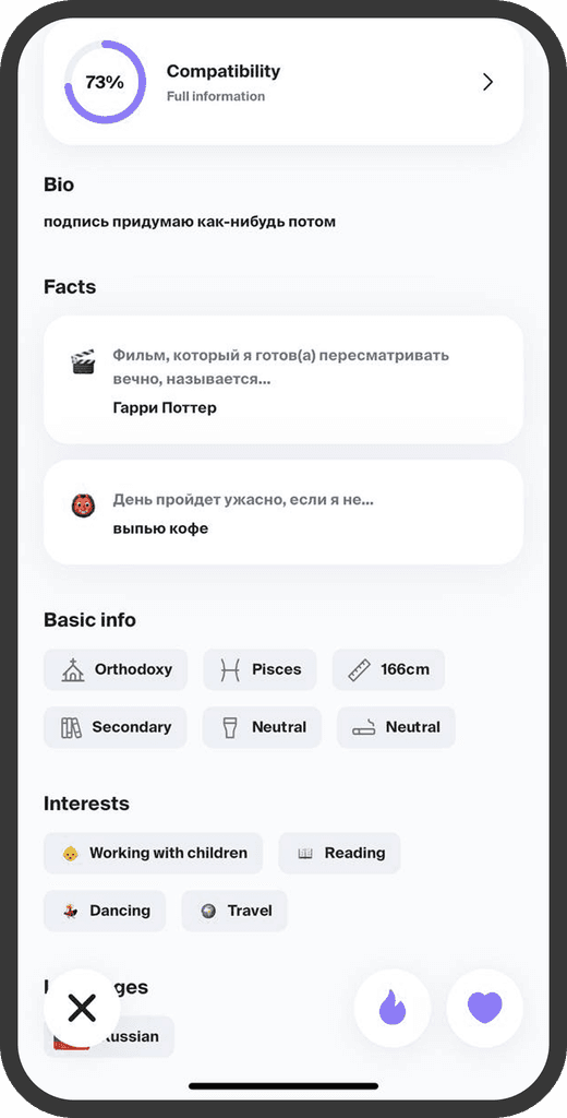 Интересы и описание анкеты выводят максимально выше, так можно быстрее узнать о человеке и свайпнуть.