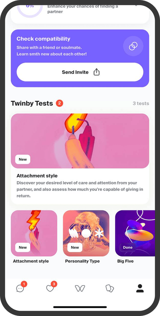 3 конкурента стараются добавить как можно больше интересов, проработать описание. Например, Twinby внедрил AI, который анализирует совместимость на основе тестов, интересов и выдает ее % в анкете.